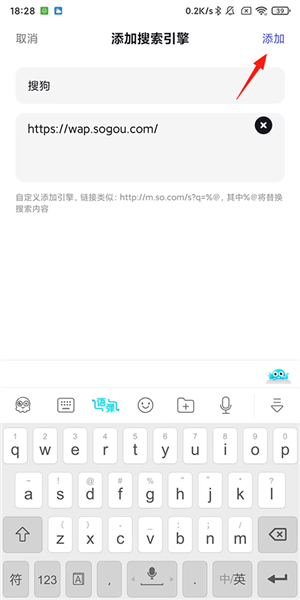 6、添加搜索引擎:输入搜索引擎名称与对应网址,点击右上角【添加】按钮,返回上一页将其设为默认并确认即可。