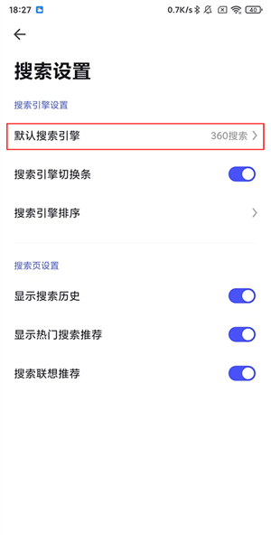 4、点击【默认搜索引擎】进入相关设置;