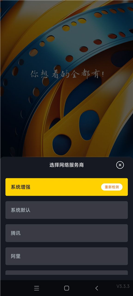 2、进入后需选择网络线路;建议尝试第三个及之后的线路,点击检测按钮进行测试。