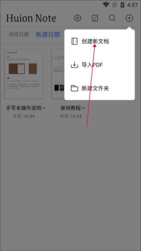1、打开HuionNote应用,点击主页右上角的加号图标,在弹出的窗口中选择创建新文档;