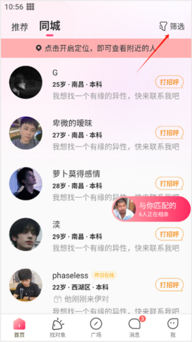 1、首先进入软件,切换到同城选项,点击上方筛选