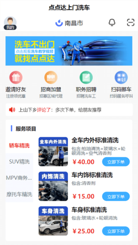 点点达上门洗车最新版是江西速达车洗汽车服务有限公司推出的专业汽车养护应用,致力于为车主提供便捷高效的上门服务。用户通过手机即可预约基础清洗或精细打蜡等项目,操作简单省时。平台还推出多种优惠,帮助用户节省养车成本,全面提升服务体验。