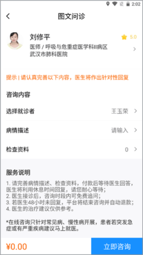 选择医生后进入咨询页面,选择就诊人、填写病情描述并上传检查资料,随后点击“立即咨询”。