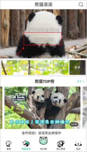 1、进入应用后,点击“熊猫滚滚频道”,再点击页面上方的“点击进入观看”即可看到活泼的熊猫;相信没有人能抗拒这些可爱小家伙的魅力。