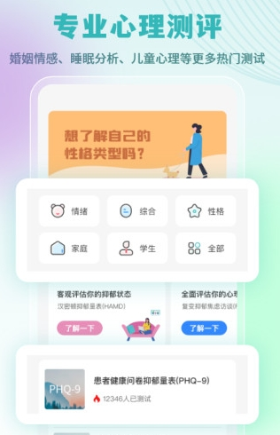 提供涵盖情绪、抑郁焦虑、职业性格、家庭婚姻、亲子教育及人际关系等上百种心理测评量表;用户可自由选择测试项目,全方位了解自身心理健康状态。
