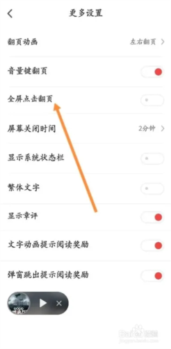 更多设置页面提供了多项自定义功能,例如翻页效果、音量键控制翻页等,找到“全屏点击翻页”选项并将其开启即可。