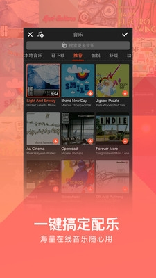 拥有丰富的在线音乐库,涵盖愉悦、舒缓、动感等多种类型;也支持选用本地音乐,增强视频的氛围感。