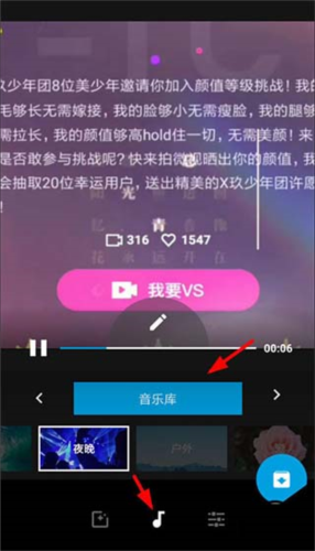 1、点击底部工具栏的音乐图标,进入音乐库挑选合适的背景音乐。