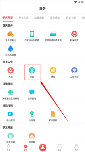2、在服务列表中选择【转会】功能,随后根据系统提示完成后续操作。