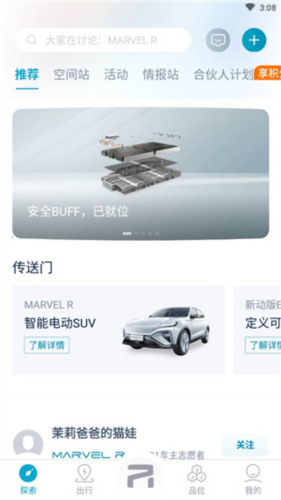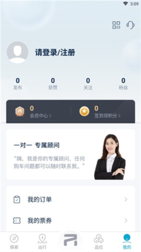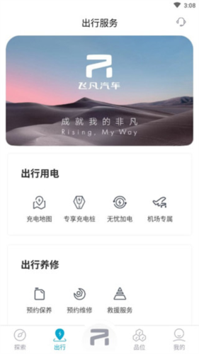 探索板块包含官方动态、社区论坛及积分商城;展厅支持在线订车、虚拟看车与试驾预约;服务涵盖专属充电、保养取送及出行协助;车信功能可通过语音发送位置,方便快速接人;我的页面集中管理积分、优惠券及车辆手册等信息。