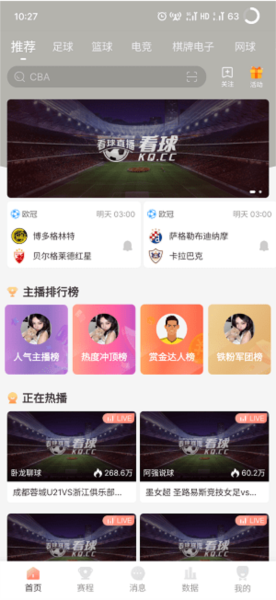 2、首页展示热门体育新闻,可观看足球、CBA、NBA、欧冠等赛事直播;