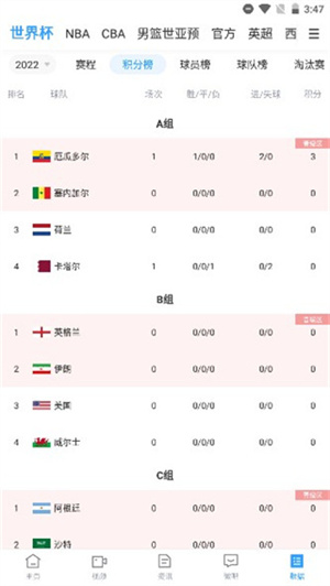 6、数据页面提供各国比赛分组详情,以及胜负、积分与排名信息。