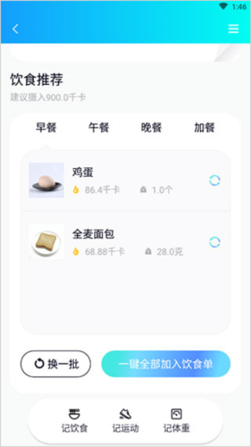 3、页面将显示一日四餐的食谱建议,用户可根据需要设置饮食忌口。