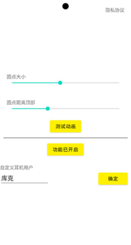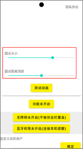 4、调整提示圆点的大小及其距离屏幕顶部的间距,点击“测试动画”即可在屏幕上方实时查看调整后的效果;