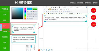 1、打开96微信编辑器,主界面左侧为素材导航区,分类包括微信公众号关注素材、标题、正文、分割线、阅读全文及分享等素材;