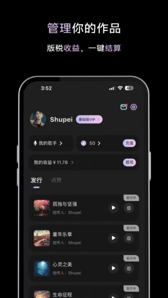 管理作品时,软件帮你集中存储所有原创歌曲,实时显示发行状态、点赞数和播放反馈。