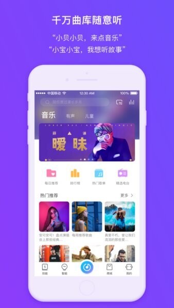 内容库很丰富,分区包括音乐、有声和儿童故事,里面有推荐和热门榜单,帮你快速找到感兴趣的东西。