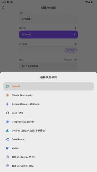 软件的核心是API连接管理,这里你能新建或编辑连接,选择模型平台并填写密钥。