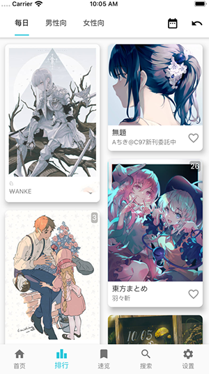 2、选择个人兴趣标签后可以查看各类排行榜,帮助用户发掘更多优质插画作品。