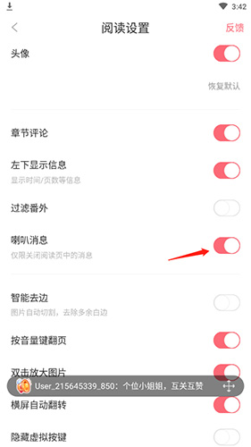 4、进入阅读设置页面,找到喇叭消息相关选项并关闭。
