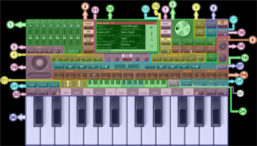 此区域包含四个选项:声音/循环、键盘组合、节奏选择、和弦/迷你键盘;