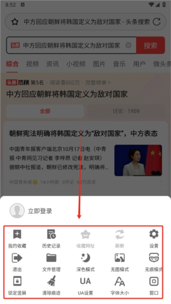 4、点击下方菜单栏,可以查看历史记录,设置无痕浏览模式等;