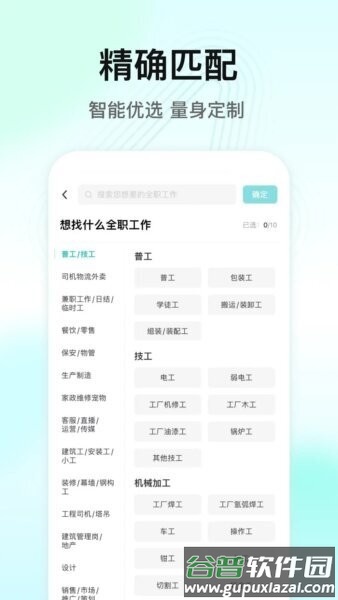 然后选择城市和岗位方向,在首页挑好目标城市,从普工、技工、司机物流等分类入手,先定好大类再细选。