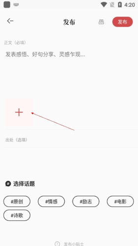 应用内设有发帖互动区,通过添加素材的功能,用户可以将视频与文案结合,使内容呈现形式更丰富,视频与文案相得益彰,提升整体吸引力。