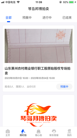 “琴岛邦博”拍卖小程序已正式上线运营,拍卖会信息将实时更新;拍品范围覆盖动产、不动产、无形资产与书画艺术品等;用户既可预约线下查看实物,也可在公告指定时间登录小程序,通过直播实时观看拍品或回放录像;更多详情可访问琴岛邦博拍卖官网查询;欢迎用户在体验过程中提出改进意见。