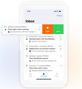GitHub移动端主要提供以下功能:滑动处理消息通知、反馈问题与回复评论、审查及合并拉取请求,并全面支持深色模式。