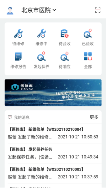 医修库app由医修技术服务(北京)有限公司开发,是一款专注于医疗设备维修服务的移动应用。该软件借助数字化与网络技术,为用户提供便捷高效的维修管理体验,有效帮助医院解决设备管理杂乱与维修成本过高的问题。通过手机即可完成设备报修、保养等操作,流程自动记录,方便各方实时跟进。