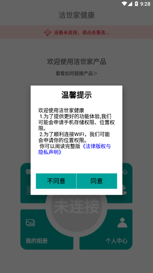 3、启动洁世家健康app,点“开始”图标。如果连接没完成,会看到灰色“未连接”图标,点它就能自动引导连接WiFi。