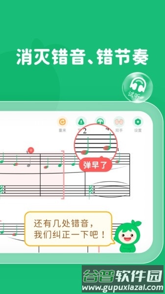 练习时弹错而不自知可能导致错误固化;使用小叶子的音符识别功能,弹错会有即时提示,帮助用户扎实打好基础。