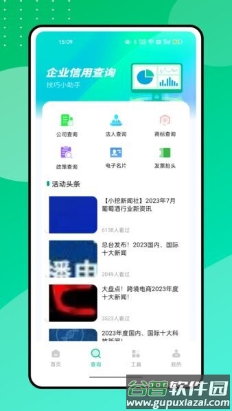 查询模块包括商标搜索,支持通过名称和国际分类筛选;还涵盖分类查看和申请人检索,以及企业信用信息查询,方便提取电子名片和发票抬头。