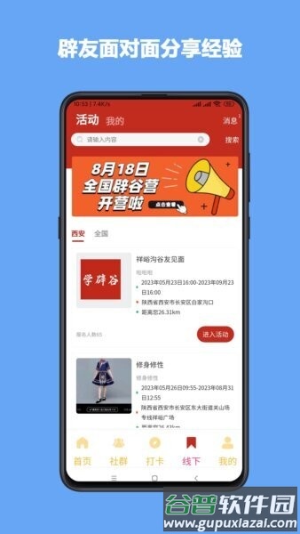 想参加活动,就去线下页面选择城市或全国选项,查看详情后报名,并按照通知去现场签到。