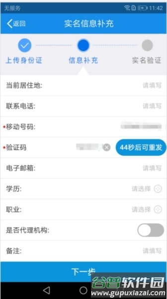 6、填写补充信息,确保手机号码真实以接收验证码,然后点下一步。