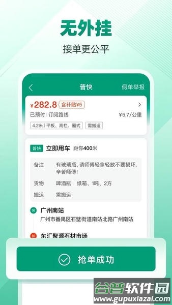 3、多类型运力全覆盖 支持普通快运、特快和拼车等,不同车种如高栏或平板都能匹配到货源,各种司机都有机会。