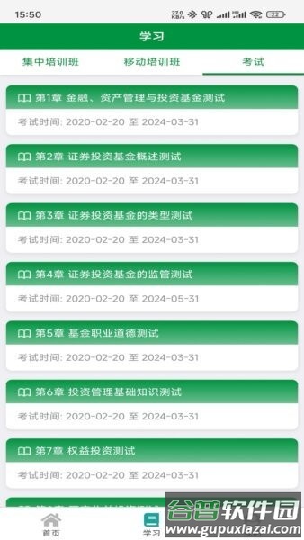 考试:章节测试与结业考核 这里按章节整理试卷,比如投资基金的各部分测试,还标注了考试时间。用户可以在有效期内反复练习,建立起完整的学习循环。