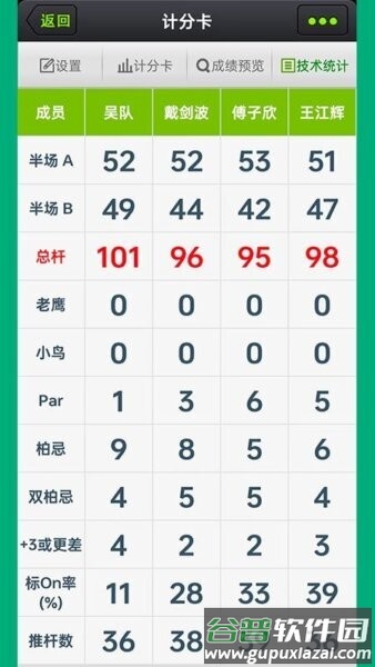 比赛前打开计分卡,选好成员进入界面;每洞输入杆数,系统自动累加半场和总成绩;随时查看成员间的对比,调整策略。