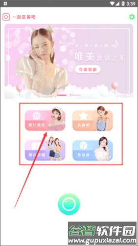 1、启动美容相机app,主界面显示图片美化、照片拼图及作品库等选项;直接点击底部按钮进行拍摄,或点选照片美化功能进入编辑;