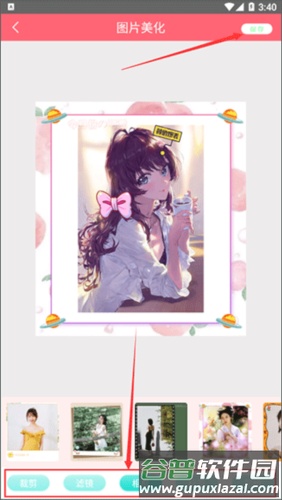 3、通过底部工具栏使用裁剪、滤镜、相框或标签等功能调整照片;效果满意后点击右上角保存按钮;