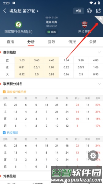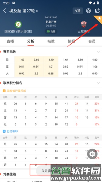 2、比赛详情页右上角通常有个五角星标志,点击它即可收藏比赛。