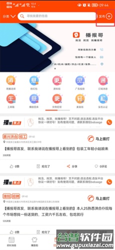 一、打开播报哥应用,在招聘街页面点击右上角的发布加号按钮。