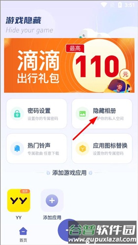 1、启动隐藏游戏计算器应用,在首页点击隐藏相册选项。