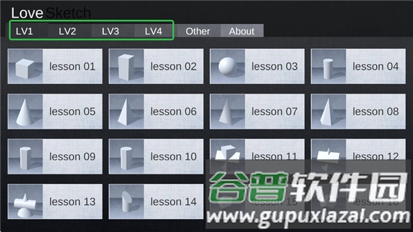 1、进入爱素描应用后,首先选择需要练习的静物,包括适合新手的几何体,以及适合进阶用户的苹果、雕塑等模型。