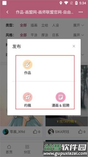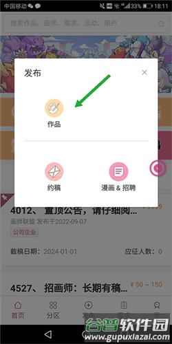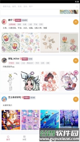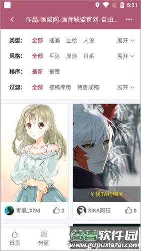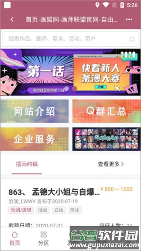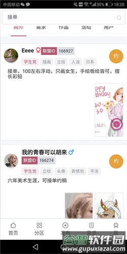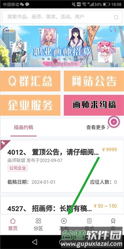 3、切换至分区页,可浏览作品、画师、排行榜及活动等内容,若遇到喜欢的画师,可直接发起约稿邀请;