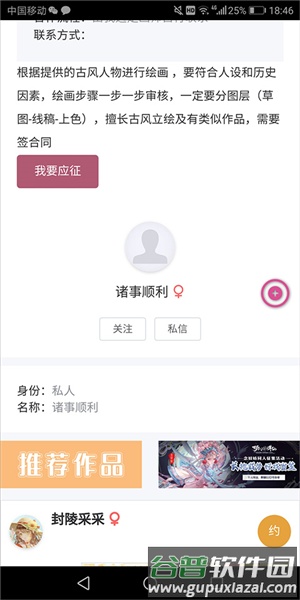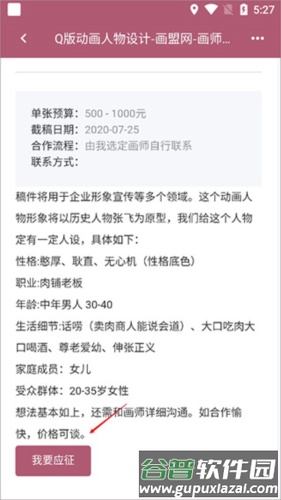 3、选择感兴趣的约稿项目,查看详细信息,点击“我要应征”或通过“私信”与发起者进一步沟通;