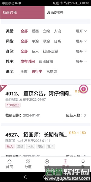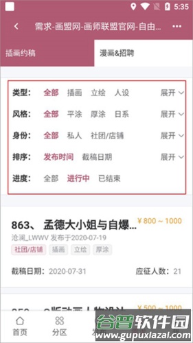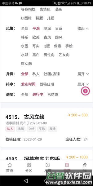 2、根据类型、风格等条件进行筛选,页面将实时刷新显示符合条件的约稿信息;