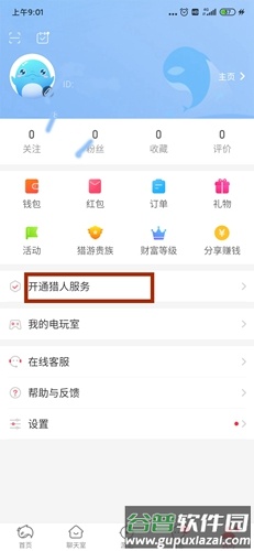 首先进入个人资料页,点击“开通猎人服务”选项。