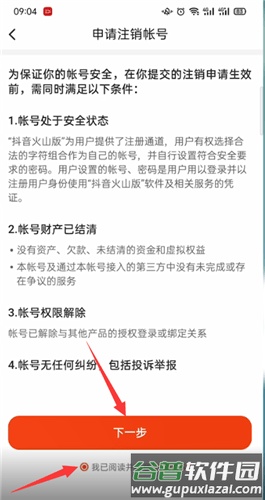 5. 在账号相关页面中,找到“账号注销”入口;仔细阅读注销所需条件,勾选同意注销协议,然后点击“下一步”。